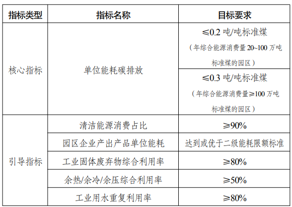 我国园区数量众多,各类园区体量规模、产业结构、用能特点差异较大,“零碳/近零碳”标准难以统一。《通知》创新提出“单位能耗碳排放”(即园区内每消费一吨标准煤的各类能源所排放的二氧化碳量),作为评判零碳园区的核心指标,引导园区在保障企业发展和用能的前提下,通过努力使碳排放达到“近零”水平。除核心指标外,《通知》还设置了清洁能源消费占比、园区企业产品单位能耗、工业固废综合利用率、余热余冷余压综合利用率、工业用水重复利用率等5项引导性指标,从能源结构、循环经济、节约资源等方面提出要求。
