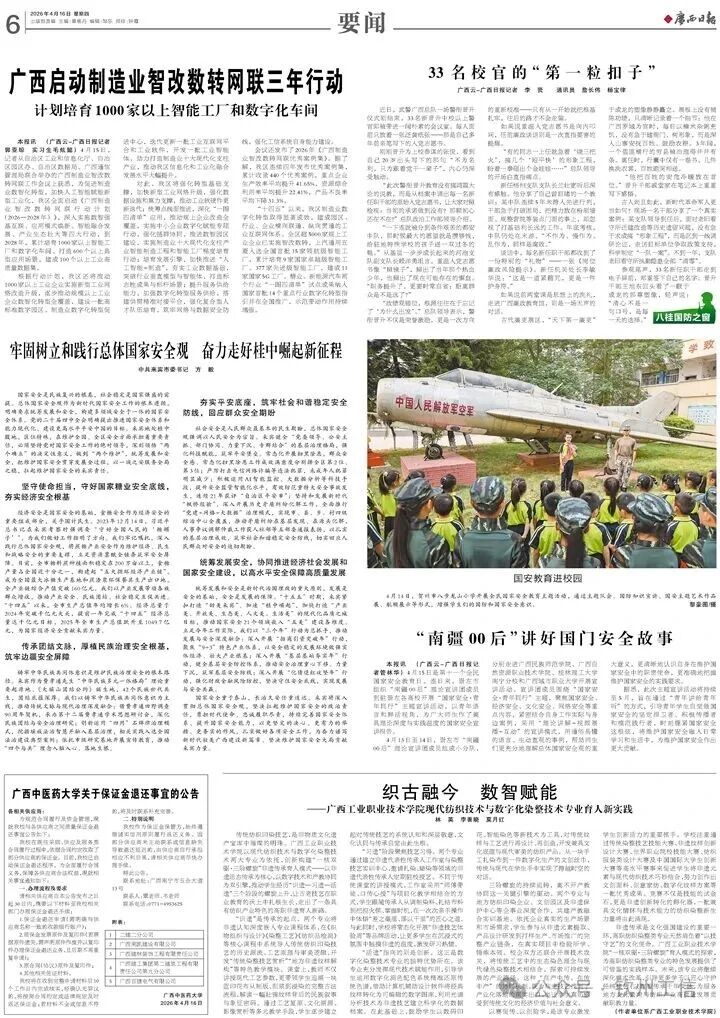 自治区工业和信息化厅、自治区园区办、自治区数据局、广西通信管理局联合举办的广西制造业智改数转网联工作会议上获悉,为促进制造业数智化转型,加快人工智能赋能新型工业化,我区全面启动《广西制造业智改数转网联行动计划(2026—2028年)》,深入实施数智强基互联、应用模式焕新、智能融合发展、产业生态壮大等四大行动,到2028年,累计培育1000家以上智能工厂和数字化车间、打造600个以上典型应用场景,建成100个以上工业高质量数据集。