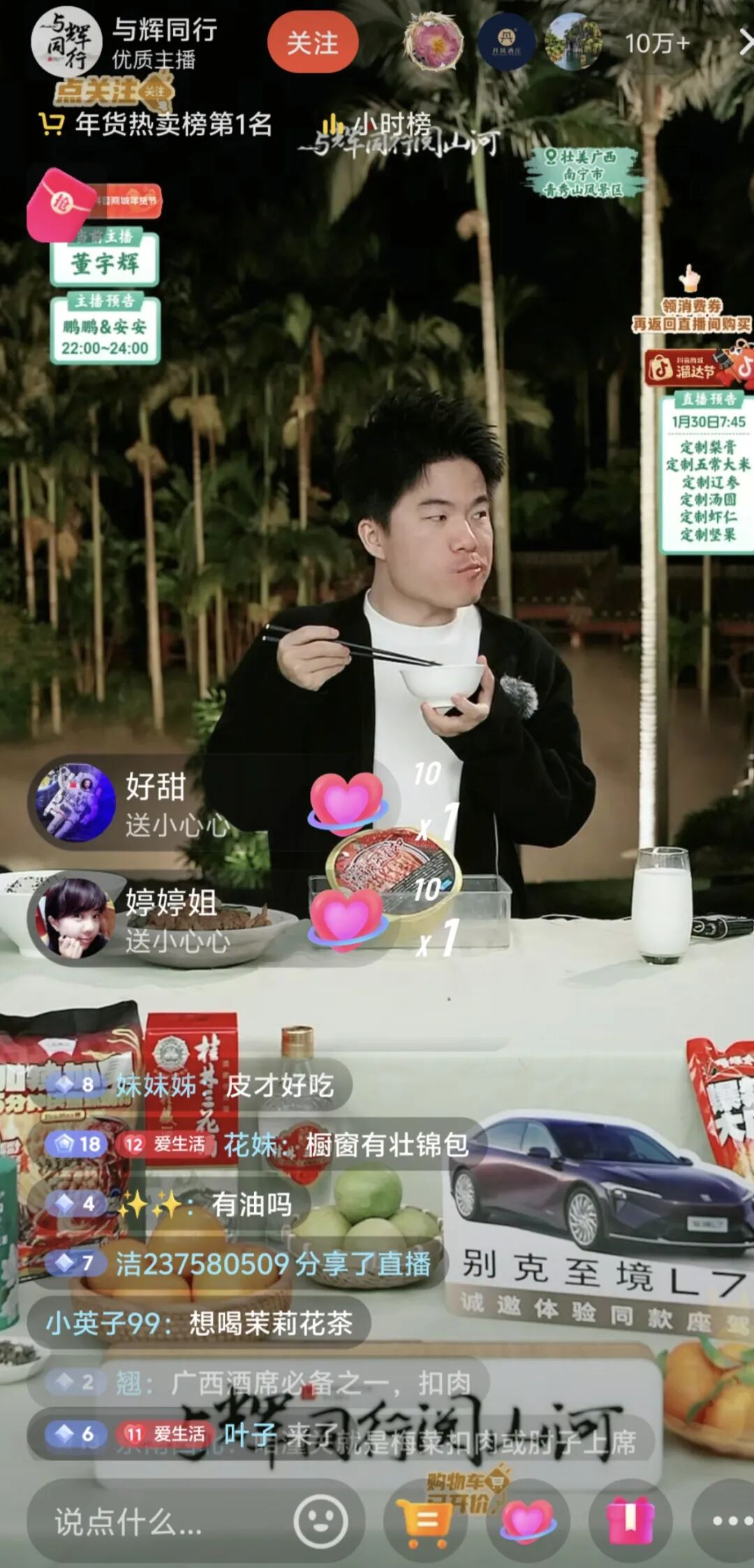董宇辉在青秀山直播,点赞广西特产。(直播截图)