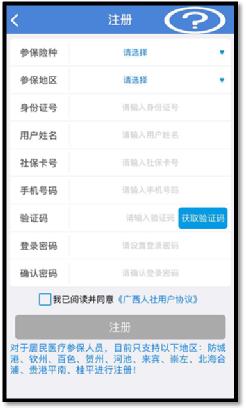 3、若已有账号,则在登录界面直接进行登录操作;若尚未注册,则点击右上方的“注册”按钮进行账号的注册操作。请根据自身情况选择正确的“参保险种”及“参保地区”,若身份证号码最后一位是X,请务必使用大写的X进行填写。