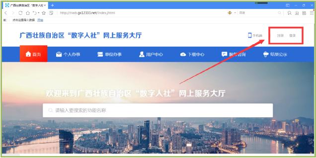或者直接打开浏览器,输入广西“数字人社”网上服务大厅地址(推荐使用谷歌浏览器):http://rswb.gx12333.net/进行注册、登录