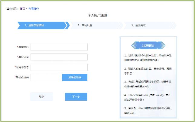 按照提示填写姓名、身份证号(如身份证最后一位是X,请使用大写输入)、手机号码之后点击发送验证码,将验证码填写完毕后点击“下一步”按钮,进入设置密码的环节。