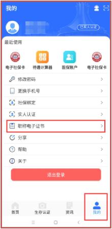 4、成功登录后,点击界面右下方的“我的”按钮,即可找到职称电子证书下载的入口。证书在手机的默认下载目录里,可以在手机文件管理里进入到Download目录就可以查到证书文件了