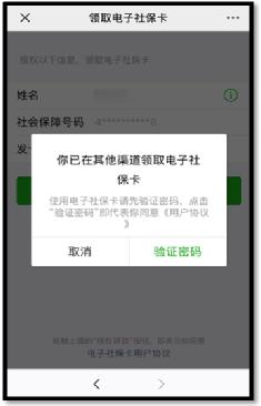 (3)核验身份信息,若此前在其他渠道已领取过电子社保卡,则需要验证电子社保卡的密码
