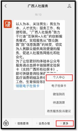 2、进入“广西人社服务”公众号后,点击“更多”菜单,跳转至“电子社保卡”进行领取