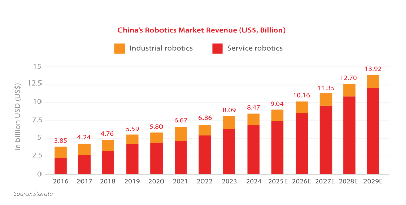 ●机器人与自动化:中国机器人市场收入预计在2025年达到90.4亿美元,其中服务机器人贡献73.7亿美元。制造自动化、物流、医疗保健和智能仓储等领域对机器人的需求不断增长,推动行业快速发展。