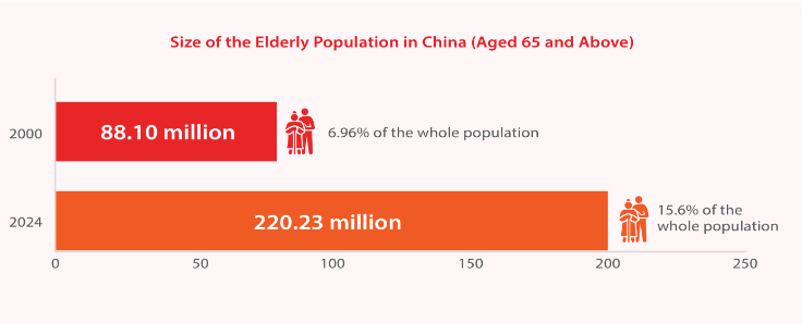 中国自2000年进入老龄化社会以来,老年人口不断增加。截至2024年底,60岁及以上人口达到3.1031亿,占总人口的22.0%;65岁及以上人口达到2.2023亿,占15.6%。预计到2035年,中国将进入深度老龄化社会,“银发经济”涵盖为老年人提供产品和服务的经济活动,以及为老龄化做准备的领域。