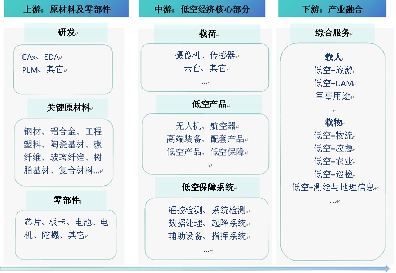 低空经济产业链上游主要为构建中游各类低空产品的原材料(包括金属原材料、特种橡胶与高分子材料等)与核心零部件(包括电池、电机、飞控、机体等);中游主要为低空产品制造、低空飞行、低空保障与综合服务等;下游主要为运营和各种应用场景(包括旅游业、物流业、文旅业与巡检业等)。低空经济产业链上游包括CAx、EDA、PLM等研发系统,以及碳纤维、工程塑料、铝合金、钢材、陶瓷基材、玻璃纤维、树脂基材等关键材料和芯片、板卡、电池、电机、陀螺等关键零部件。这些元素是低空经济产品制造的基础,决定了产品性能和成本,对整个产业链的健康发展具有基础性影响。中游环节是低空经济产业链的核心,包括无人机、航空器、高端装备及配套产品的生产制造,以及低空保障与综合服务等。这一环节的企业不仅要处理好上游原材料和零部件的整合,还要面向下游市场,满足各种应用场景的需求。中游环节的技术创新和产品质量直接影响到低空经济的竞争力和市场占有率,因此是产业链中最为关键的部分。下游环节主要聚焦于产业融合,即如何将中游生产的无人机、航空器等产品及服务应用于各个场景中,包括但不限于低空旅游、低空农业、低空物流、医疗救护、航空摄影、空中巡查等。下游的应用创新不仅能够推动低空经济的商业模式多元化,也为中游甚至上游的研发和生产提供方向,形成良性的产业发展循环。