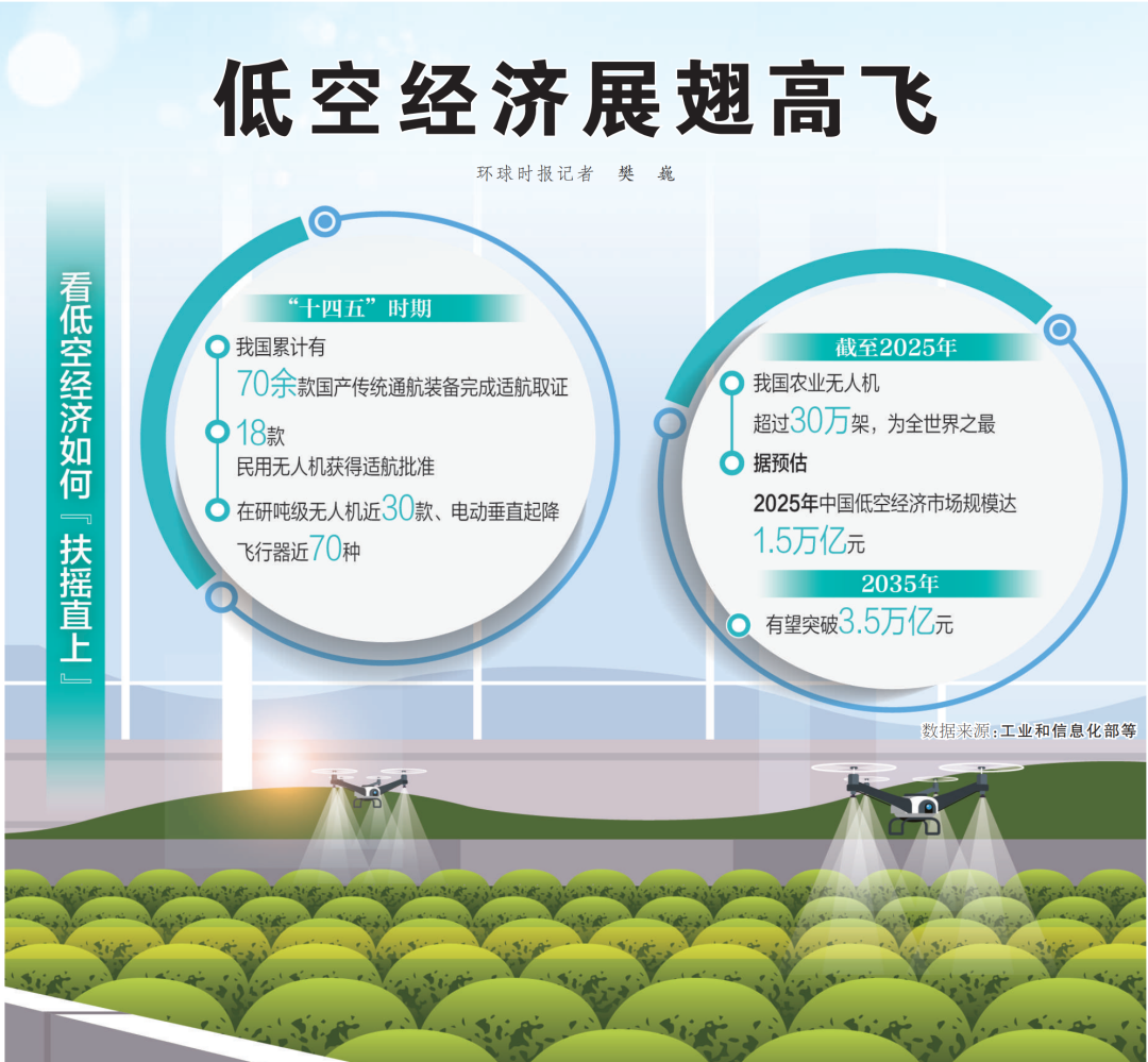 工业和信息化部统计数据显示,“十四五”时期,我国累计有70余款国产传统通航装备完成适航取证,18款民用无人机获得适航批准,在研吨级无人机近30款、电动垂直起降飞行器近70种。截至2025年12月30日,已有1081家企业完成登记注册,备案产品3623种,超529万架。