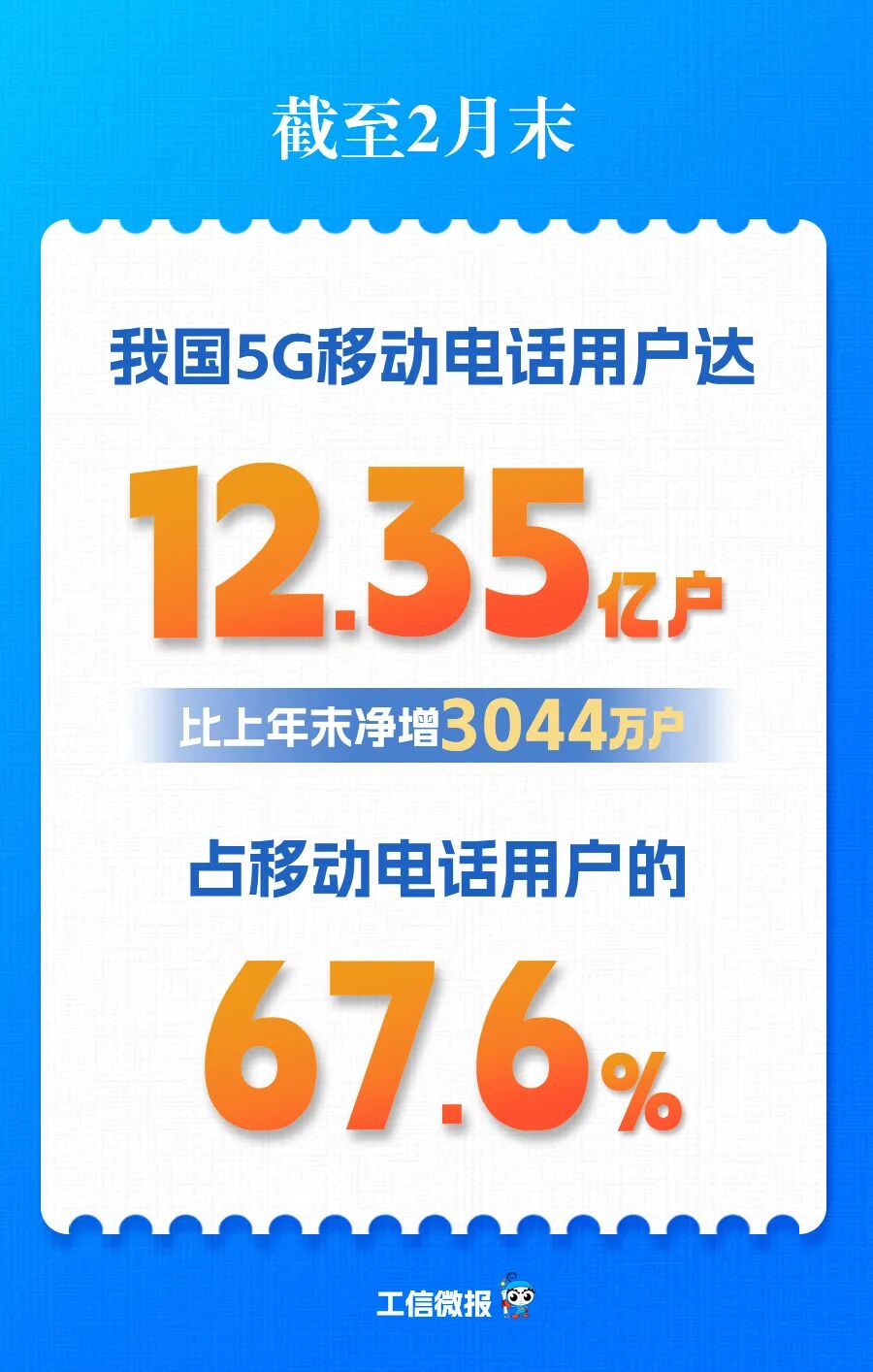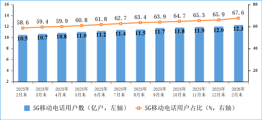 5G用户数持续增加。截至2月末,三家基础电信企业及中国广电的移动电话用户总数达18.26亿户,比上年末减少100.1万户。其中,5G移动电话用户达12.35亿户,比上年末净增3044万户,占移动电话用户的67.6%。