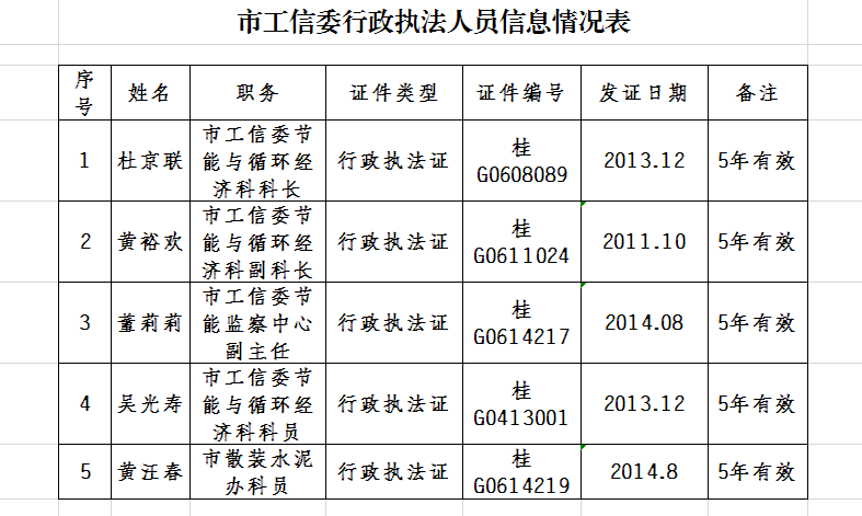 2015年钦州市工业和信息化委员会行政执法人员信息情况表