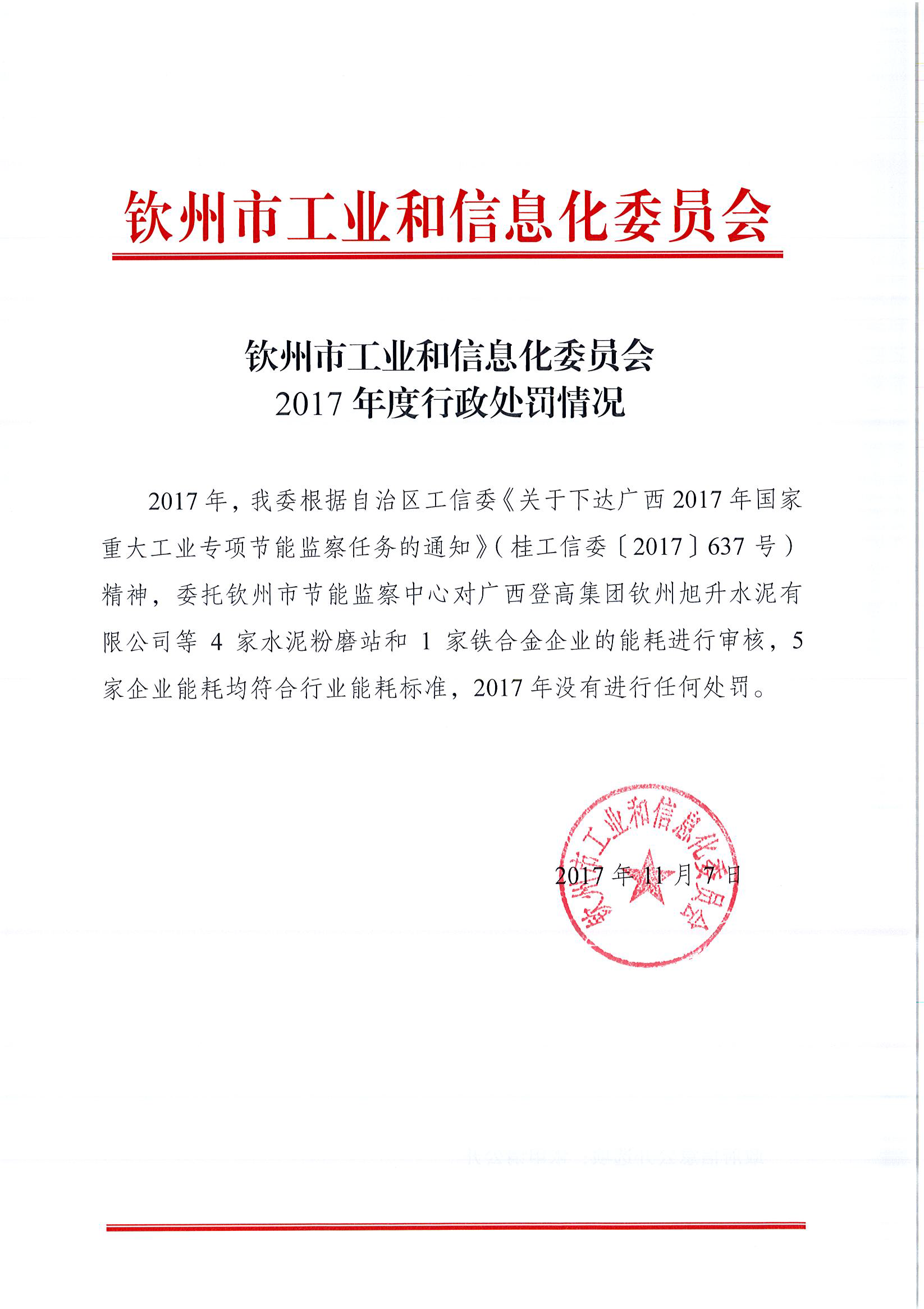 钦州市工业和信息化委员会2017年度行政处罚情况