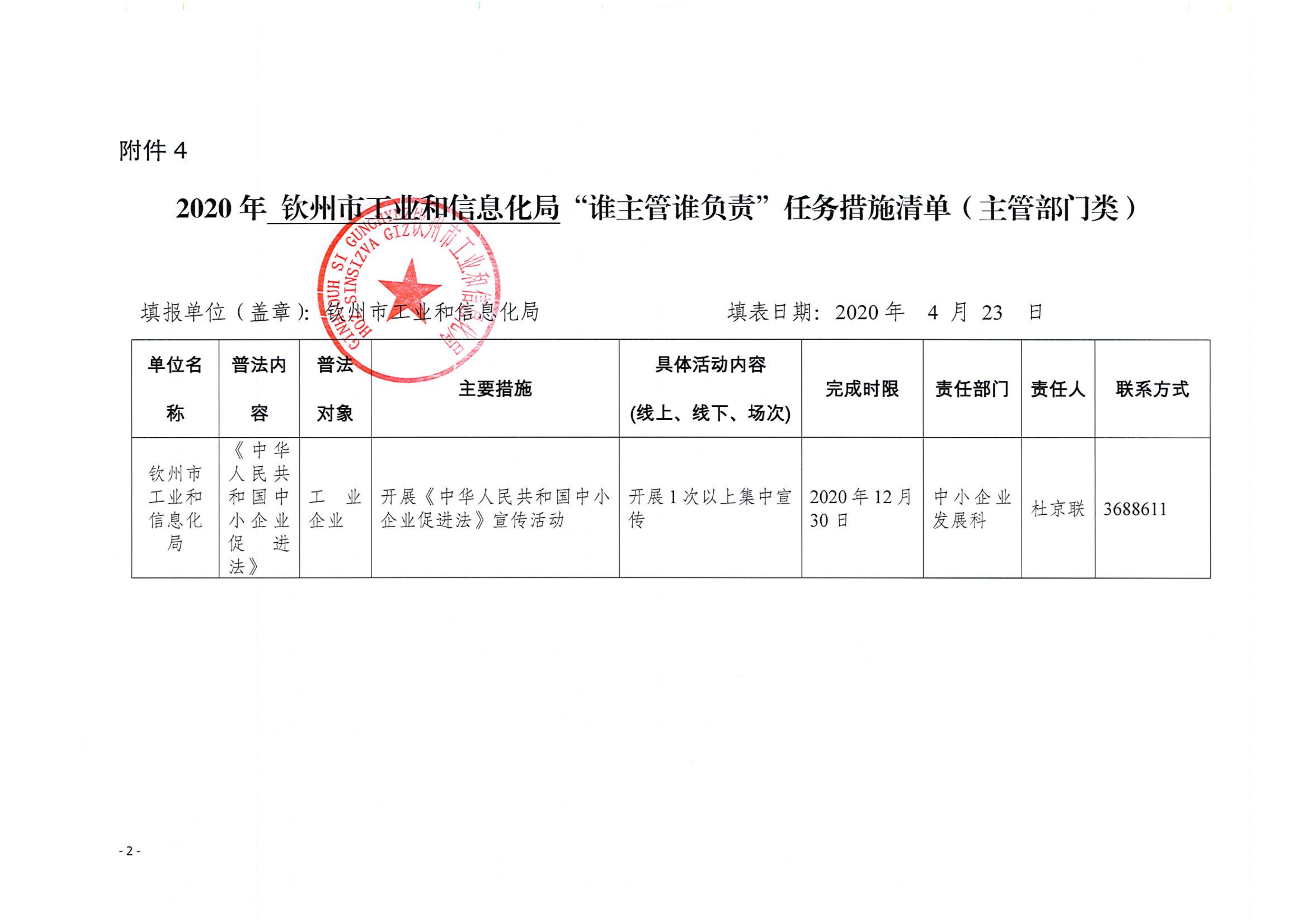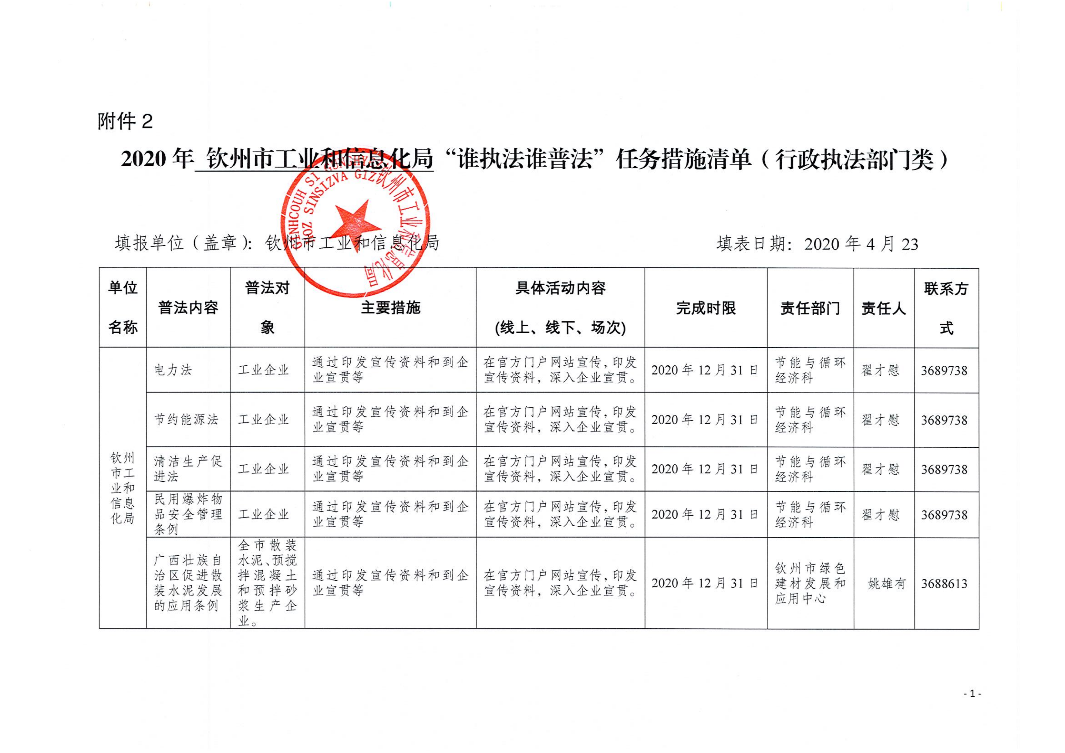 2020年钦州市工业和信息化局“谁执法谁普法”“谁主管谁负责”任务实施清单