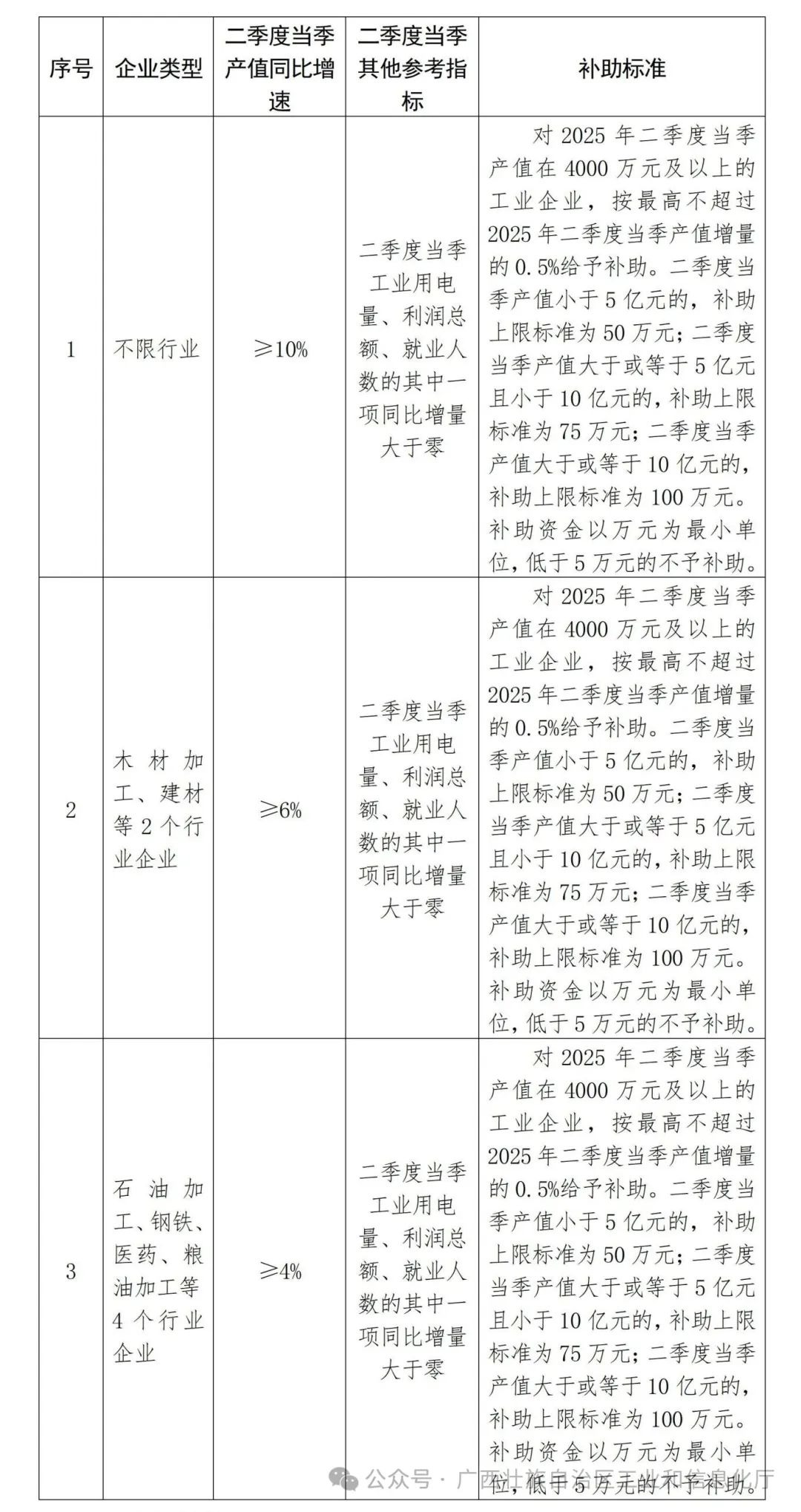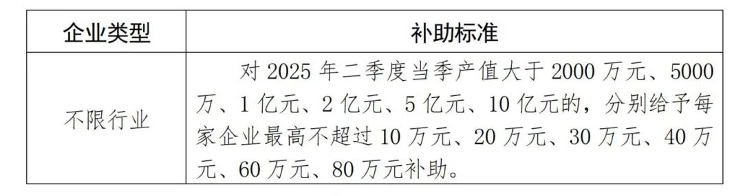 根据企业2025年二季度当季产值、工业用电量、利润总额、新增用工人数等指标情况,分行业分类给予企业一定的资金奖补(如下表),用于支持企业增加用工、采购生产物料、降低物流成本和加强安全生产等。注:以下各项不得重复申报,补助标准为上限标准。