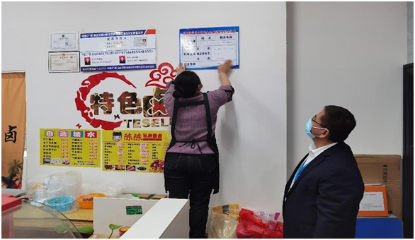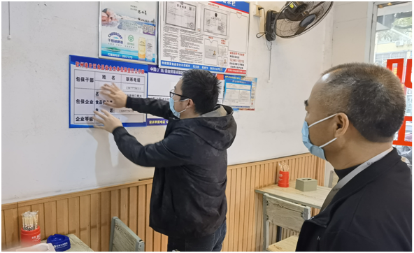 ▲特派员韦彭、许展源检查餐饮店食品安全工作,粘贴责任公示牌