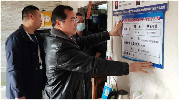 12月9日,片区产业服务中心协理主任、特派员朱自云组织投资板块同志及特派员认真学习《钦州市落实食品安全“两个责任”工作指南》,结合“出机关 强服务”活动,深入一线餐饮市场,检查生产指出存在的问题,提出整改意见,确保片区群众“舌尖上的安全”。
