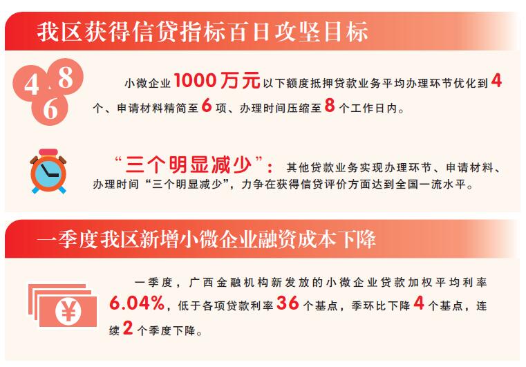 根据部署,我区获得信贷指标攻坚的目标任务为“468”和“三个明显减少”,即小微企业1000万元以下额度抵押贷款业务办理实现“468”目标,平均办理环节优化到4个、申请材料精简至6项、办理时间压缩至8个工作日内;其他贷款业务实现办理环节、申请材料、办理时间“三个明显减少”目标,力争在获得信贷评价方面达到全国一流水平。