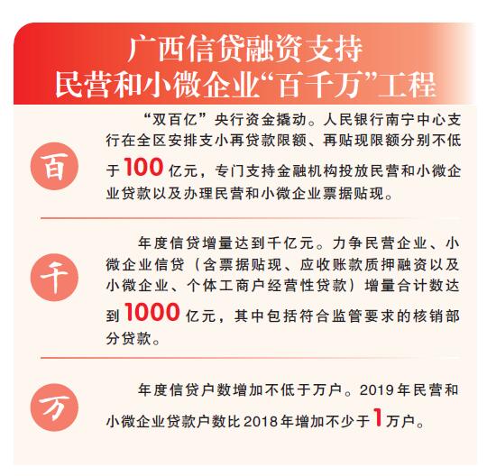 这是一份“含金量”十足的动员令。人民银行南宁中心支行安排专项再贷款、再贴现分别不少于100亿元,专门支持金融机构投放民营企业和小微企业贷款,以及办理民营和小微企业票据贴现,通过“双百亿”央行资金引金融机构活水精准滴灌民营小微企业。从总量看,我区今年力争实现民营和小微企业贷款融资新增1000亿元,确保新增信贷户数不低于1万户。
